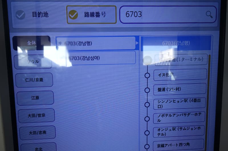 江南に行くには「6703」路線です。チケットを買う前に、番号が表示されているバス乗り場を確認しておくとスムーズです。仁川国際空港には、複数のバス会社が乗り入れているので、間違えないようにしましょう。