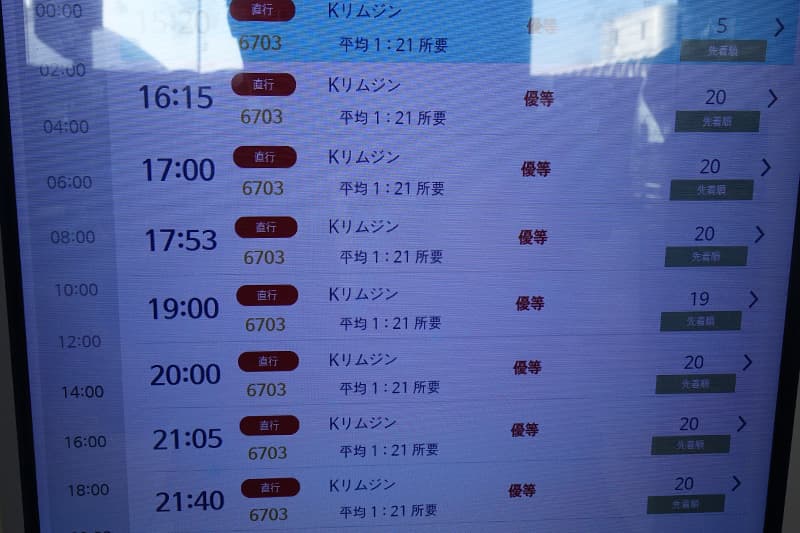 バスの出発時刻と残席が出てきます。乗りたいバスの時刻を選択します。所要時間も出てきます。