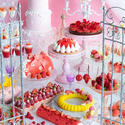 ティータイムに「プリンセス舞踏会へようこそ」と題したストロベリーデザートビュッフェを開催。約25種類のデザートは「ストロベリーレッドカーペット」や「夢のひととき ローズチョコレートクリーム」など、苺づくしの華やかなメニューが並びます。