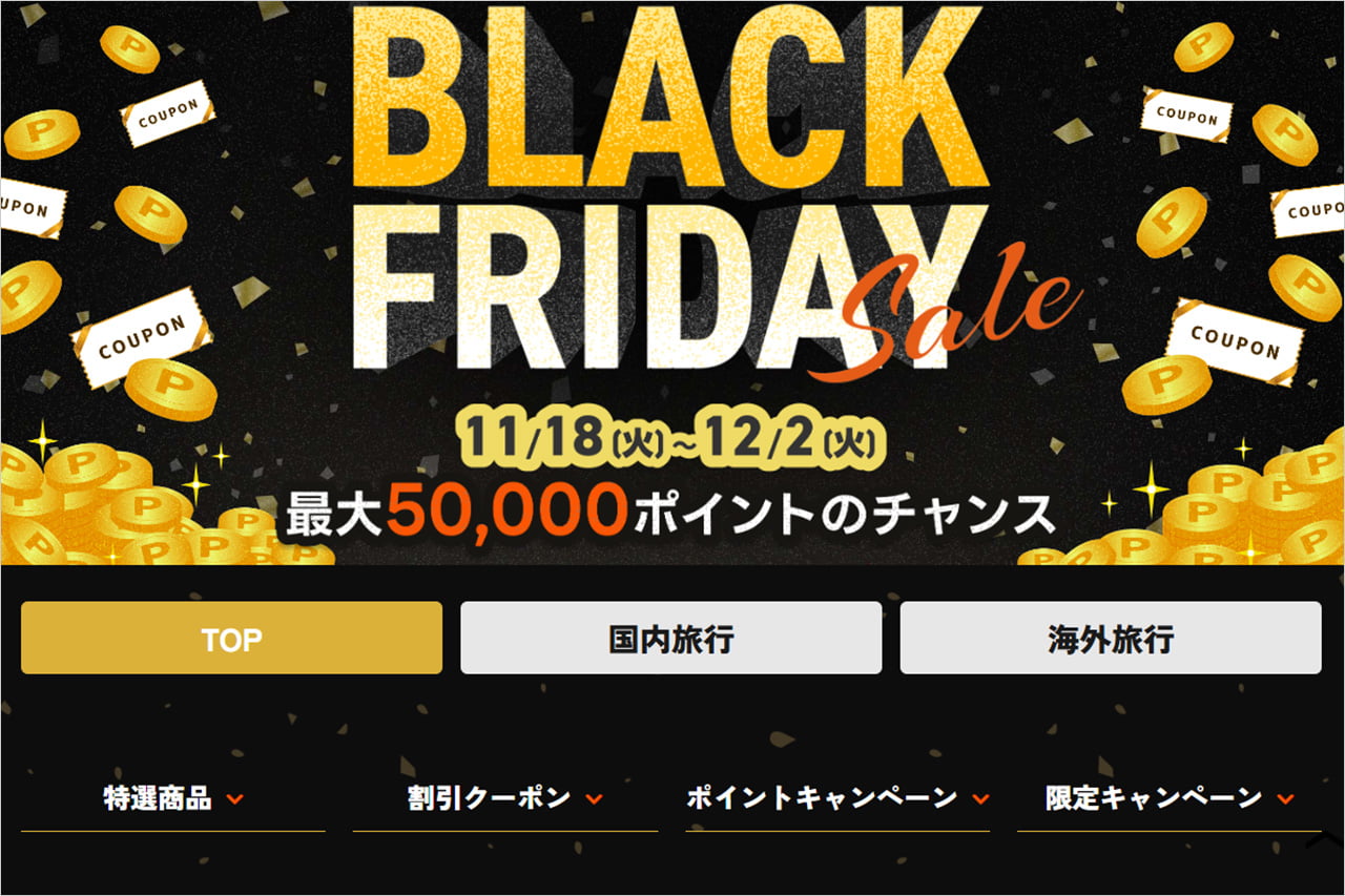 JTBブラックフライデー2025では、割引クーポンで、国内旅行、海外旅行をお得に予約できます。